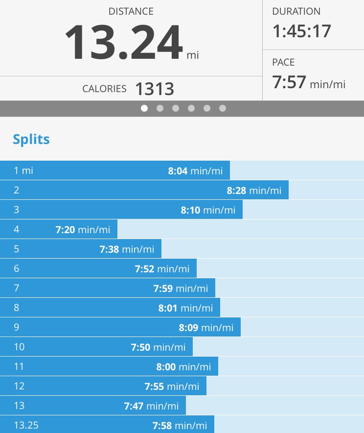 They didn’t have half pacers so I tried to stick with the 3:30 marathon pacer. Out the gate I felt pretty good. Mile 1 was my warm up (pace 8:04) but I knew I couldn’t go too slow because there were big hills miles 2 and 3. Anticipating that those would be my slowest miles, I kicked it up a notch when we went downhill 4-7. Things got pretty flat thereafter. Every mile I got my pace notification and knew that I was on track, I just had to stay focused. Luckily my body, the weather and the course allowed me to do that. Miles 10-13 are always tough for me so I found a quick competitor and tried to match her foot cadence. (Thank you whoever you are!)